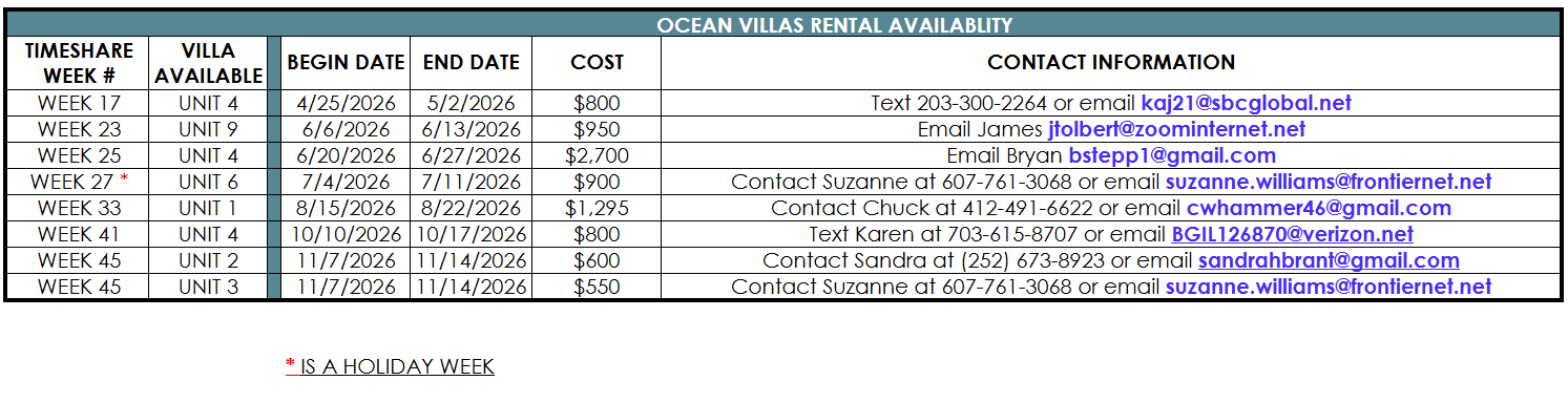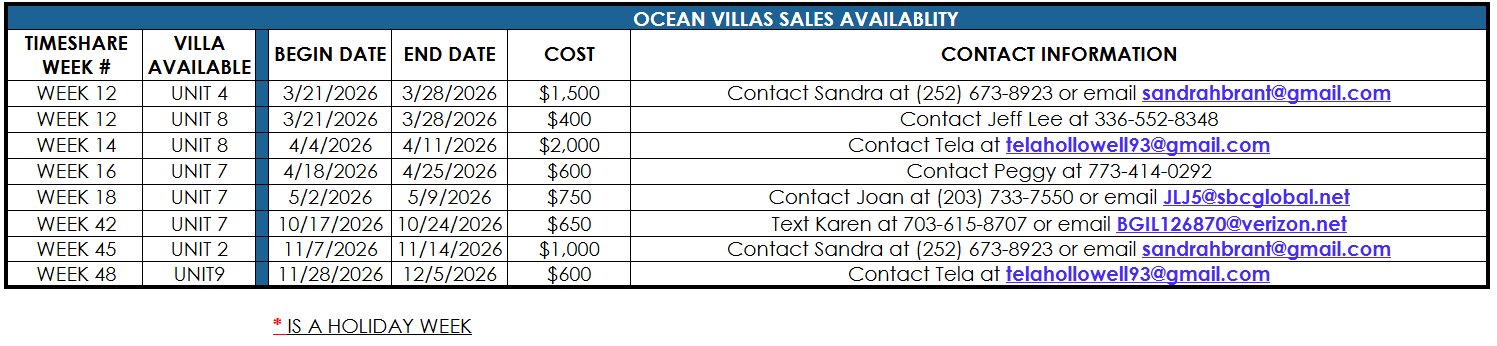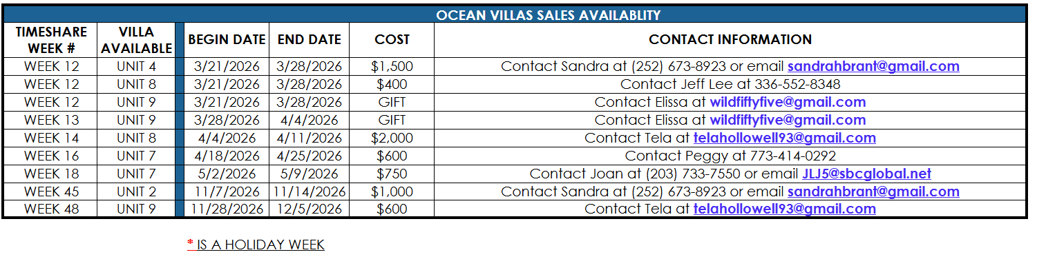 Owners wishing to rent or sell your unit/week please contact us via phone at (252)441-4130 or via email at ov7031@gmail.com